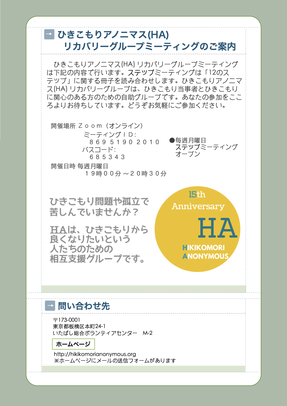 それぞれに生きづらさを持つ私たちは、ミーティングでの分かち合いと12のステッププログラムを通じて、再び社会とのつながりを模索しています。 HA15周年記念文集『ひきこもりからの回復』HAの15年間の歩みと個人の体験談・経験